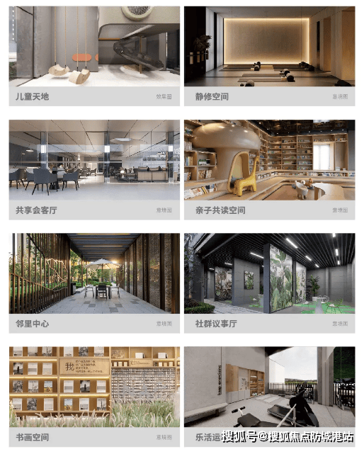 社区内配备八大生活空间,包括儿童天地、静修空间、邻里中心、社群议事厅、共享会客厅、亲子共读空间、书画空间、乐活运动空间,满足不同年龄段业主的生活需求。其中,乐活运动空间涵盖健身房、休闲运动区等,为业主提供便捷的运动场所;儿童天地针对儿童成长特点设计,保障孩子安全游玩的同时,促进邻里互动。