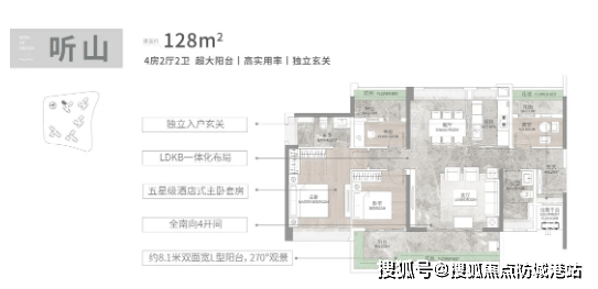 建面108平3+1房:四开间朝南,近6米南向阳台搭配270度景观视野,采光通风俱佳。采用LDKB一体化设计,打造5.9米大方厅,拓展公共活动空间,满足家庭聚会、休闲娱乐等需求。奢阔大主套设计,配置南向大飘窗、独立卫浴与L型衣帽间,兼顾私密性与舒适度,为业主提供专属尊崇空间。
