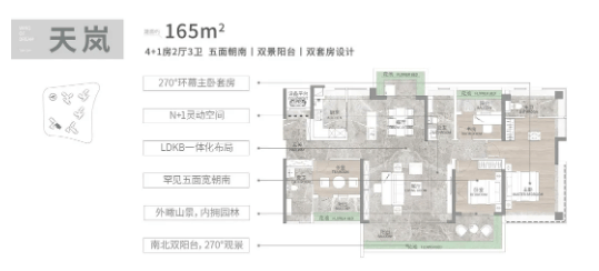 建面165平4+1房大平层:定位高端改善户型,双阳台南北对流,四开间朝南,朝南面宽达到17.4米,近9米L型景观阳台环绕,三面望山景,将自然景观引入室内。中式厨房搭配独立西式岛台,满足不同烹饪需求,适配高端家庭的生活习惯。双主套设计保障家庭成员隐私,南北对流让卧室空间通透舒适,主卧同样配备270度折叠屏飘窗,尽显豪宅质感。